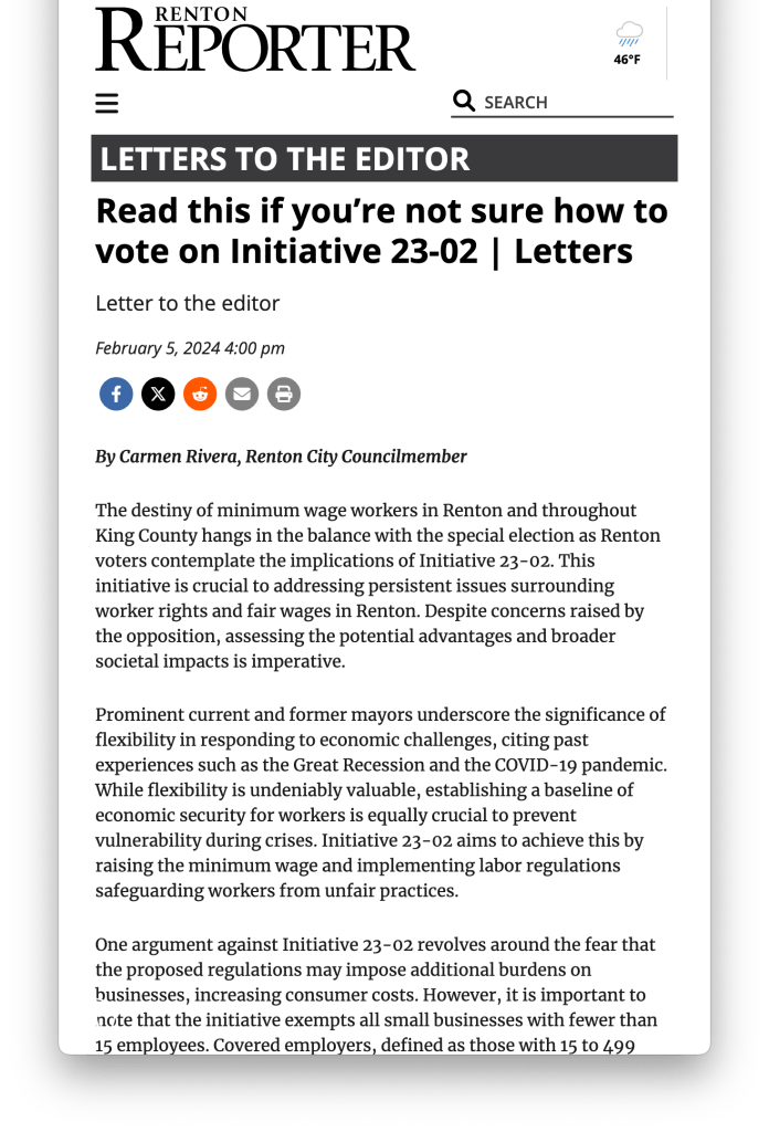 On this topical show, Crystal welcomes Renton City Councilmember Carmen Rivera and Raise the Wage Renton Steering Committee member Maria Abando to learn more about the upcoming citizen initiative on the February 13th special election ballot.